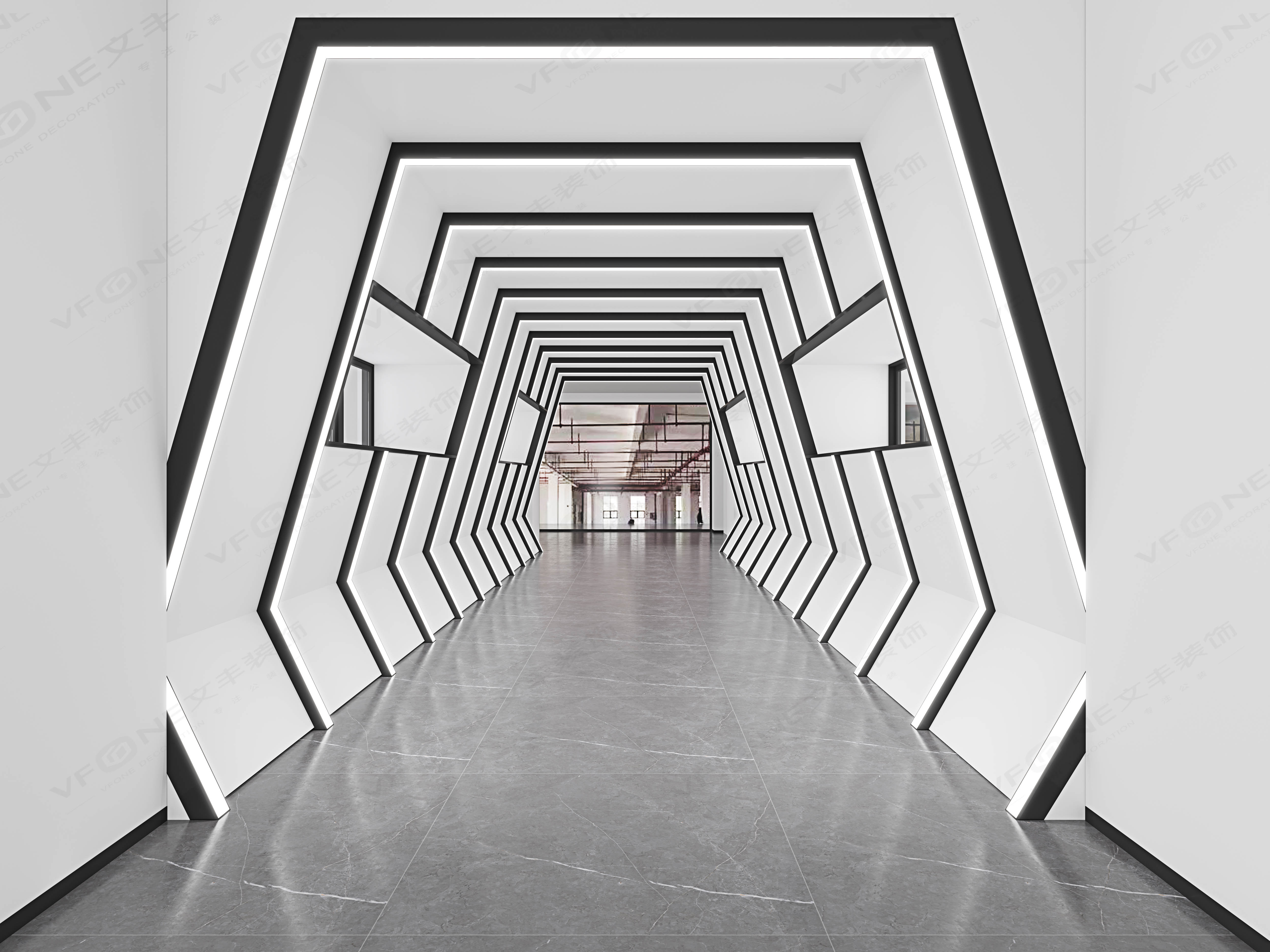 重復(fù)的線性幾何形態(tài),抽象地展示獨(dú)具特色的科技未來感。深圳的裝修公司運(yùn)用簡單的黑白配色、造型設(shè)計、燈光效果,打造出富有賽博朋克風(fēng)格的科幻廊道。創(chuàng)意性地串聯(lián)了不同的空間屬性,使訪客在空間過渡時感受到極強(qiáng)的趣味性。