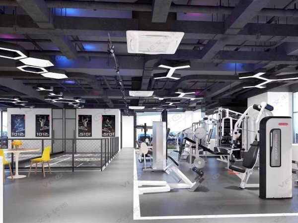 健身房裝修燈光的設計也是一個重要的環(huán)節(jié)。對于活動空間來說,最好選用吸頂燈,透光性能好的吸頂燈既能保證室內光線充足,并且美觀節(jié)能,符合現(xiàn)代簡約式健身房裝修設計風格?;诤喖s式裝修風格的調性,在色彩的使用上盡量平均色值的層次感,選用淡雅的高級灰更易 使顧客沉浸在專注健身運動的狀態(tài)。局部高飽和的藍紫色能增強空間的活力,讓人感受到健身房獨有的活力感空間屬性,在專注中保持一絲激情與動感。