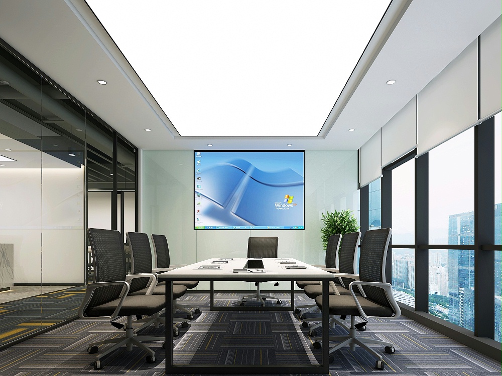 會議室采用透明玻璃的通透性與黑白灰色調(diào)的組合對空間進(jìn)行再創(chuàng)作,形成半開放性會議室,并配合天藍(lán)色與亮黃綠色營造嚴(yán)謹(jǐn)、舒適、具有未來科技感的會議室空間,用冷色調(diào)的地毯、座椅和燈光營造與一般會議室氣質(zhì)不同的寫字樓設(shè)計(jì)氛圍。深圳辦公室裝修設(shè)計(jì)