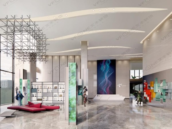 設(shè)計師根據(jù)甲方時尚前衛(wèi)的企業(yè)屬性,將前廳的空間導(dǎo)向性削弱,打造成開敞式的展廳空間。擺放與網(wǎng)游IP相關(guān)的立像擺設(shè),烘托出網(wǎng)游公司輕松時尚的企業(yè)屬性。展廳空間充分利用空間原有采光以及地理位置,在視覺上牢牢抓住人的眼球。天花頂層的鏤空鐵藝結(jié)構(gòu),呼應(yīng)塊狀分布的區(qū)域布局,將前廳劃分出動線清晰的空間區(qū)域,使人產(chǎn)生不同的過渡體驗。