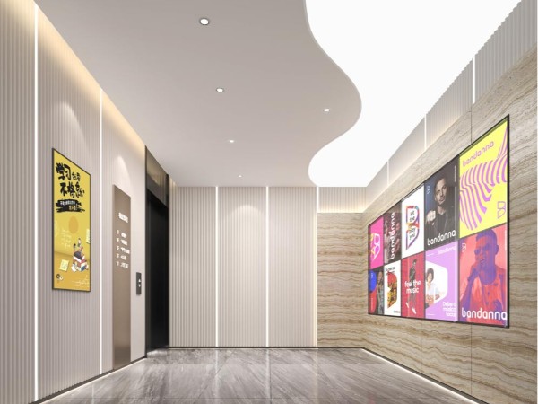 本案中的商場設計風格整體時尚前沿感比較強,專業(yè)裝修公司運用簡約而富有質感的材質,既不會讓商場裝修整體的展示效果顯得過分張揚,也能給一個復合型的商業(yè)空間帶來年輕人感興趣的時尚前衛(wèi)精致的氛圍。頂層通過擺布不同線條走勢的吸頂燈帶,透露出足以提供正常照明的燈光光線豐富空間的層次感,地面大理石材質的裝飾材料,柵格式墻面裝飾形態(tài),多元化的展示海報設計排版疏密有度,使人視覺上充滿著新鮮趣味性,避免顧客在等電梯時陷入視覺審美疲勞,增強空間的細節(jié)耐看程度。