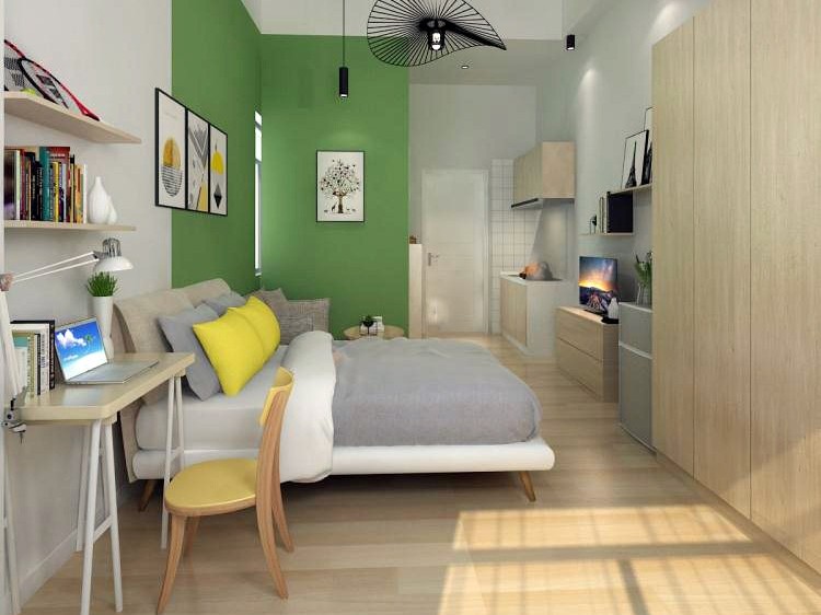 明亮的空間讓人的心情更加的舒適,這樣的空間更加適合剛畢業(yè)的學(xué)生。每次回到公寓看到自己的空間,干凈而又舒爽,明亮透氣。在這樣的環(huán)境中生活是讓人身心愉悅。屏風(fēng)的設(shè)計(jì),將兩空間分割開(kāi)來(lái),但是透明屏風(fēng)的使用,讓這個(gè)空間有了視覺(jué)上的延長(zhǎng),造成了分隔而不是“分割”的效果。燈飾的選擇也讓這個(gè)空間增加了設(shè)計(jì)感。