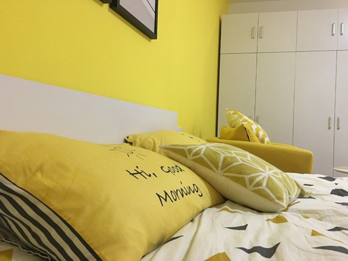 波普風(fēng)格的床單凸顯了年輕人的流行品味,窗簾柔和的面料讓硬朗的房間多了一份舒適感。大膽采用明艷的色彩,白色家具桌椅和黃色沙發(fā)幾何椅的適當(dāng)點綴平衡了空間的色彩關(guān)系。另外,從心里暗示來說,黃色是 “安撫色”,是會讓人產(chǎn)生樂觀態(tài)度令人安靜并放松的顏色,契合公寓建立的初衷。深圳公寓裝修設(shè)計